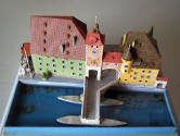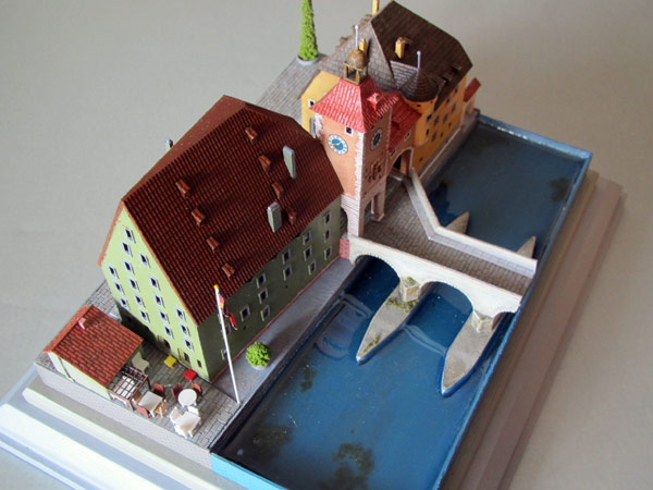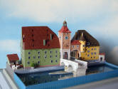 The Old Stone Bridge at Regensburg, Germany, is a 12th century bridge across the Danube linking the Old Town with Stadtamhof. For more than 800 years, it was the city's only bridge across the river. It stands as a marvelous tribute to the master medieval engineers who built it. The bridge originally had three towers, of which the South Tower - a Gate Tower to the Old City, survives. It dates to around 1300. The clock was added in 1648. Next to the tower are the 16th century Amberg Salt Store and the later 17th century Regensburg Salt Store. Beside the larger salt store, is the small "Sausage Kitchen", the oldest restaurant in the world. A version of this restaurant was in existence in the 12th century when the bridge was originally built. Like the name implies, they only sell sausages. The bridge was built in only 11 years. It has served as a model for other stone bridges in Europe - the Elbe bridge in Dresden, London Bridge, and Charles Bridge in Prague. Today, this stretch of the river is used only by recreational shipping. Larger craft bypass it to the north by means of the Regensburg-Danube Canal. The bridge is closed to vehicles and is only used by pedestrians and bicycles. The Old Stone Bridge is as much a symbol of the city of Regensburg as is the beautiful Cathedral. Today the city looks very much like it did in earlier centuries - thanks to being largely untouched during World War II. =<><><>= |